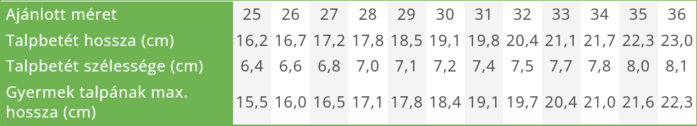 MÉRETTÁBLÁZAT: