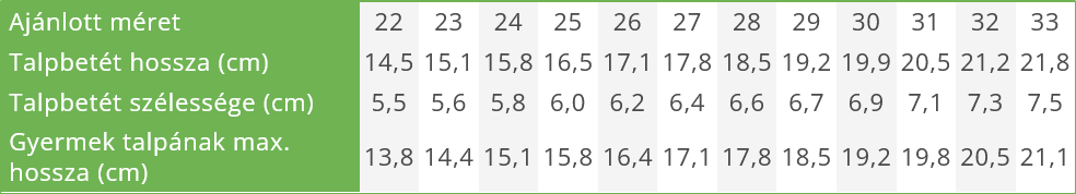 MÉRETTÁBLÁZAT: